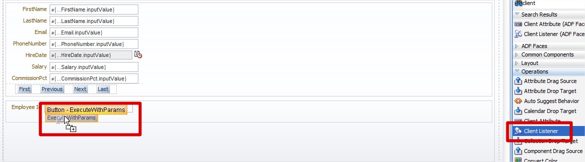 For that, we will drag an operation component call “Client Listener” over the CommandButton. On the Method name write down the name of the JS function, and choose “action” for the Type: